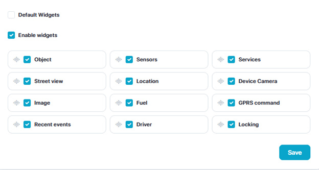 To add or remove widgets, disable the “Default Widgets” option, then customize the widget list as desired.