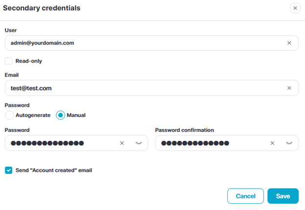 To set up secondary credentials enter the user affected, choose if it is Read-Only. Then you will need to enter a secondary email address, choose if the password will be auto generated or typed in manually, also, select whether an email will be sent on the account creation.