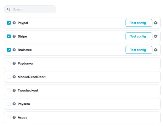 You can choose from multiple providers, each supporting secure and reliable transactions. Once configured, users will be able to complete payments directly through the selected gateway.