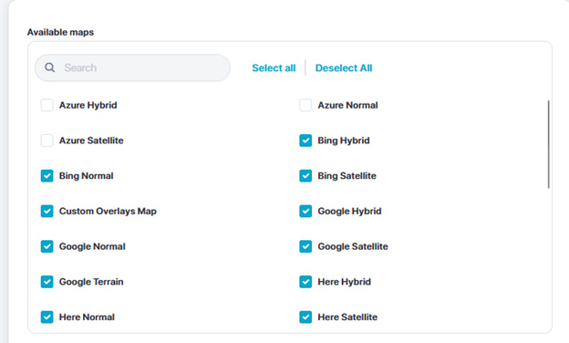 All new users will be granted access to the selected maps by default. This setting does not affect existing users’ preferences. For example, if an existing user has Google Normal enabled, disabling it here will not change their settings.