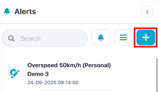 To create an alert, choose "Alerts" from the side panel menu on the main map window and press "Add alert" button (blue "+" symbol icon) on alerts panel.
