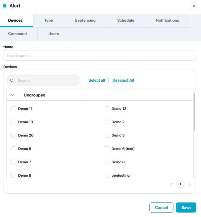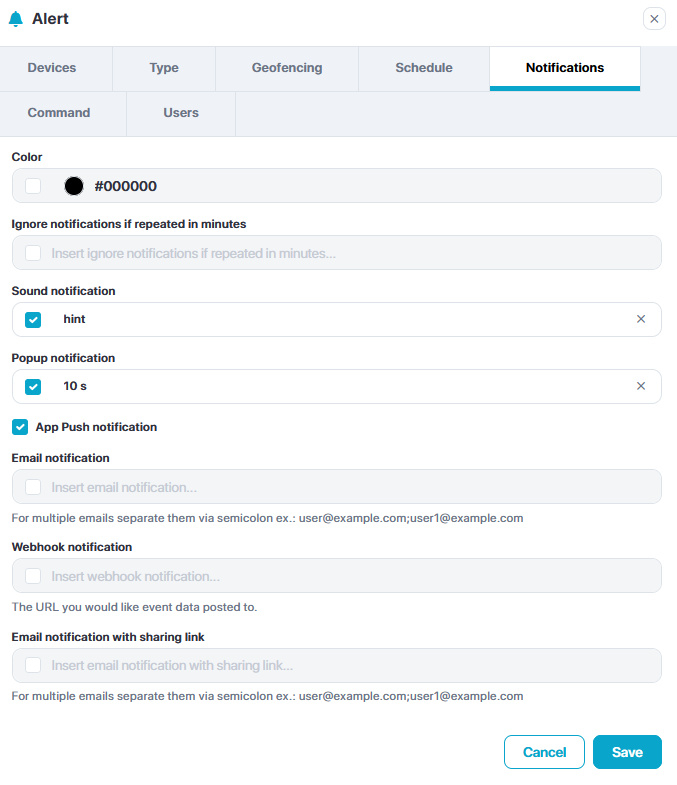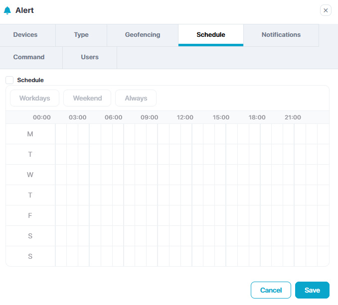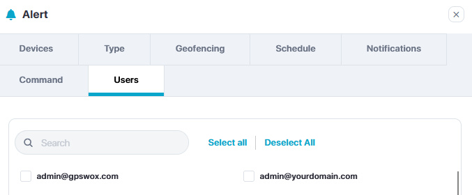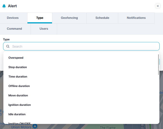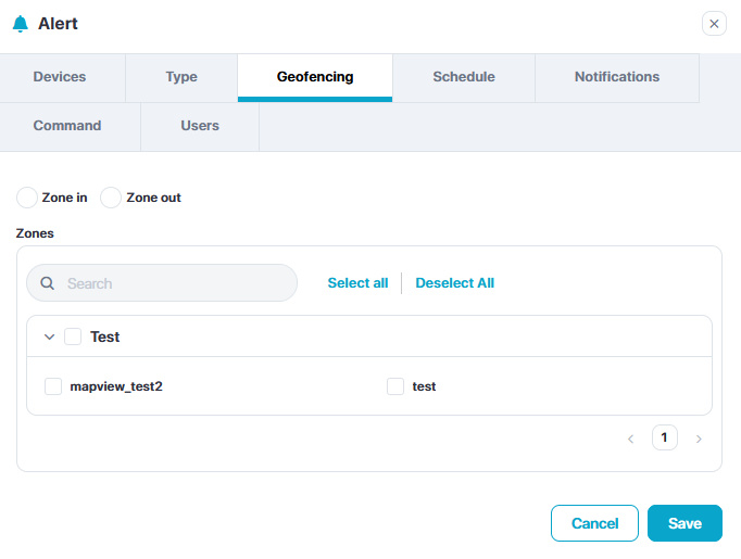 Select geofences that will generate alert when objects are moving inside or outside the geofences. This will work together with other types of alerts. For example, it will generate overspeed alert only when moving inside or outside geofence.