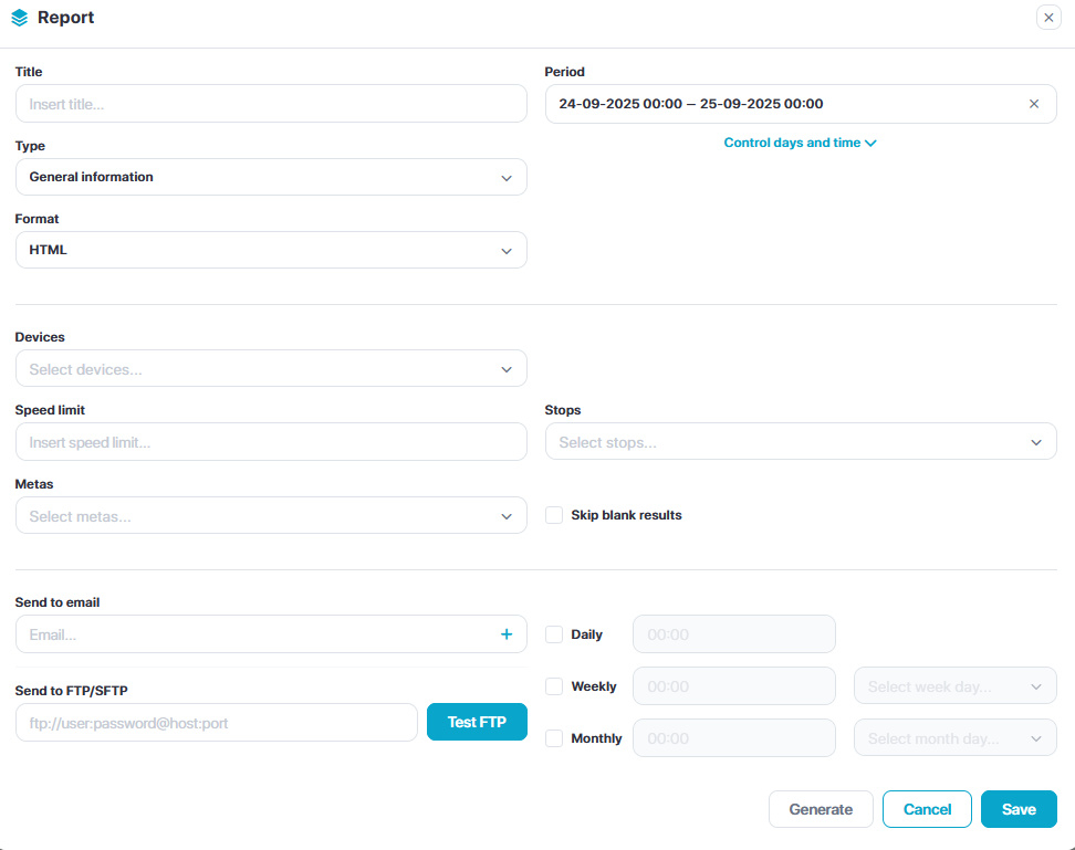 - Speed limit (kph) - speed limit for Overspeed and Underspeed reports.